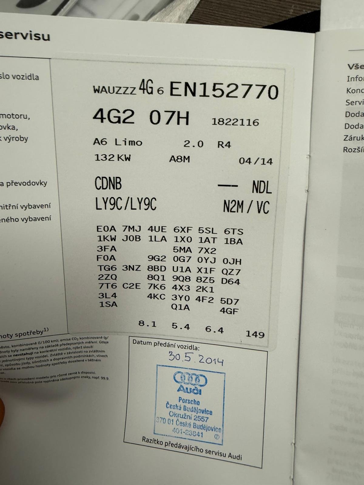 rcátko vněj. asfér., levý, ráfek z leh. slitiny 7,5x16 (7-paprsky), paket Leštění, rozhraní Multimedia MMI Navigation Plus s MMI Touch, kotouče brzd. vpředu (320 mm x 30 mm), držák nápojů v konzola stř., opěrky hlavy za. (3-krát), zařízení park. vpředu a za., optický (APS Plus), zajištění proti krádeži pro kola (bezpečnostní šrouby kol), obložení stropu látka, černá, kotouče brzd. za. (300 mm x 12 mm), sklo atermické zeleně tón., druh pohonu: pohon př., svítilny za. LED, kamera zpětná, indikátor kontroly tlaku v pneumatikách, airbag hlavový (boční ochrana), zrcátko zpět. vni. s ztmavování automat., zrcátko vněj. el. nastav., vytáp. a sklop., s Memory, zrcátko vněj. barva vozidla, akumulátor 92 Ah, zrcátko vněj. asfér., vpravo, motor 2,0 Ltr. - 132 kW 16V TFSI KAT (CDNB), regulátor rychl. (tempomat), zásuvka (12V-zásuvka) v prostor zavazadl./ložný, víko zavaz. prostoru el. ovládaný (otevřít + zavřít), paket Odkládaní, zařízení výstražné pro pásy bezpeč., světlo denní potkáv. LED, kamera př. a kamera zpětná, paket Světlo, rohožky velur, protiskluzová regulace (ASR), systém vypínání/startování Advanced Key (komfortní klíč), servozavírání pro víko zavaz. prostoru, nádrž paliv.: 75 Ltr., servořízení řízený elektron., volant (kůže) s multifunkce, potah sedadla / čalounění: látka Effekt, start/stop systém, opěradlo sedadla za. dělený/sklop., motor 2,0 Ltr. - 132 kW 16V TFSI, sedadla vpředu el. nastav. (levý s Memory), sedačka vpředu, spouštěč okna el. vpředu + za., paket Kouření, sloupek řízení (volant) mech. nastavení výškové/podél., sklo čelní s clona (pásový filtr) nahoře, asistent brzdový, senzory světelné a dešťové, soustava brzd. s Systém rekuperace, varovný systém proti krádeži + zabezpečení vnitř. prostoru / ochrana tažná, pneu 225/60 R16 ..V, klimatizace komfort-autom. 2-zónový, Pomocný systém řidiče: asistent dálkových světel, Pomocný systém řidiče: startovací asistent (hold asistent (Audi)), převodovka aut. - Multitronic, zamykání centr. s ovládání dálk., opěrka ruky stř. vpředu, opěrka ruky stř. za. s přihrádka, s nízkou úrovní škodlivin podle normy výfuk. emisí Euro 5, příprava zařízení proti odciz. / asistent zaměření (Vehicle-Tracking-System, VTS), síť zavaz. prostoru zajišťov., zrcátko vněj. el. sklopný, elektron. uzávěrka diferenciálu (EDS), zrcátko vněj. s funkce paměti, servořízení elektromech., imobilizér (elektronický), ukazatel multifunkční / počítač palub., rezervní kolo jako nouzové kolo, rozhraní Multimedia MMI základní / MMI rádio, airbag boč. vpředu, vybavení interiéru: vložky ozd. Mikrometallic, protiblok. brzd. systém (ABS), Audi Drive Select, Pomocný systém řidiče: asistent rozjezdu do kopce, elektron. stabiliz. systém (ESP), airbag strana řidiče/spolujezdce, uchycení Isofix pro dětská sedačka, Pomocný systém řidiče: systém ochrany cestujících (Audi pre sense basic), údržba: Longlife-Service, karoserie: 4-dv.